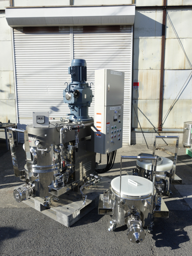 3M-6型 ディスパー(40φmm)×2機 (2機中1機はホモミキサーに変換可能) アンカー×1機 ディスパー:2,000~8,000rpm ホモミクサ:2,000~12,000rpm アンカー羽根種類:2種 容量 : 満水9.9L/撹拌~6L モーター容量 : 0.4kw2P(d2G4)×2機/0.4kw4P(d2G4)×1機 電圧 : 3相200V 真空 : 可 ジャケット : 有 接粉部材質 : SUS304・テフロンコーティング |