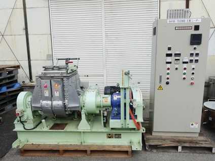 GA50-15GWB-E型 ヒーター加熱:~250度 容量 : 全125L(公称) 仕込50L(公称) モーター容量 : 羽根:11kw/4P 横転:1.5kw/4P 電圧 : 3相200V 真空 : 不可 ジャケット : 有 接粉部材質 : SUS316L SCS16(羽根) SCM435(軸:接液SUS316Lライニング ブレード形状 : ディフェレンシャル・バンバリー |